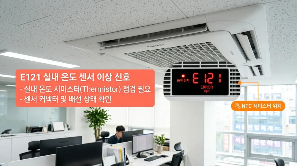 삼성전자서비스 공식 안내(samsungsvc.co.kr, 2025년)에 따르면, E121·E122·C121·C122는 모두 실내기 온도센서(NTC 써미스터) 이상으로 발생하는 에러예요. 이 센서는 실내 온도를 측정해서 에어컨이 냉방 강도를 조절하는 데 사용해요.