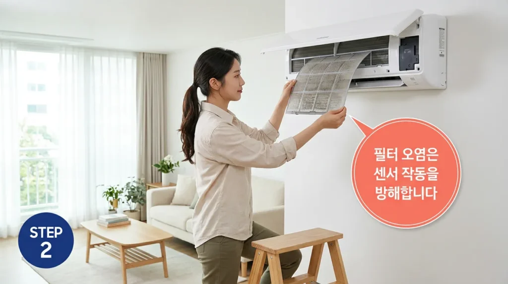 ✅ 2단계: 실내기 흡입구 주변 먼지·이물질이 센서를 막고 있는지 확인해요.