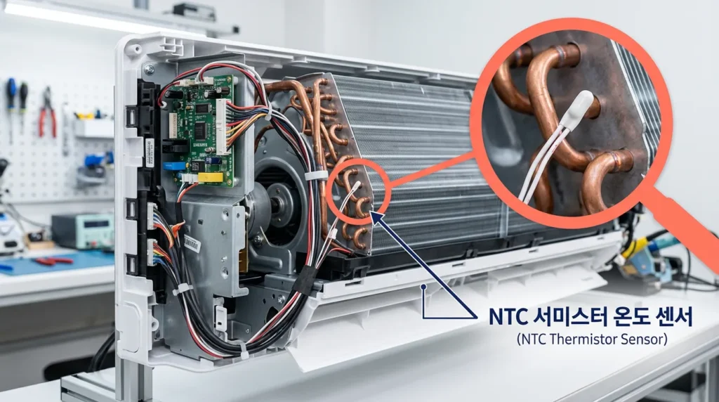 NTC 써미스터는 온도에 따라 저항값이 변하는 소자인데, 수명이 다하거나 물리적 충격·결로 등으로 손상되면 에러값을 지속적으로 보내요. 삼성전자서비스 공식 기술블로그(2025년)에 따르면, 이 부품의 교체 비용은 공임비 포함 3~7만 원대가 일반적이에요.