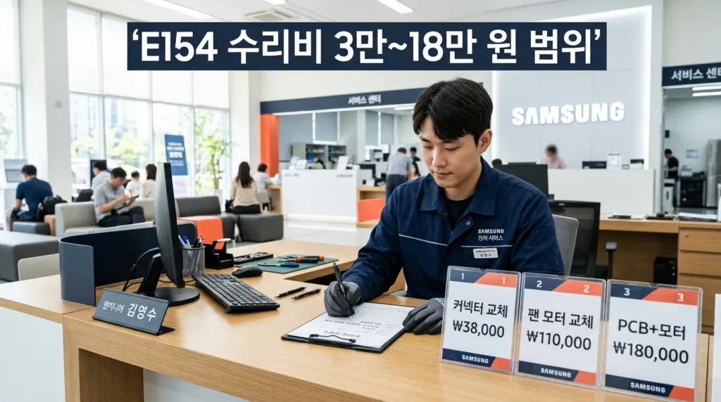 삼성 에어컨 E154는 실내기 팬 모터 이상 에러예요. 먼저 차단기 리셋(1분 전원 차단)을 시도하고, 반복된다면 커넥터 불량이나 팬 모터 교체가 필요해요. 수리비는 커넥터 교체 시 약 3~4만 원, 모터 교체 시 약 11만 원, PCB 동반 교체 시 약 18만 원 이상이에요. 삼성전자서비스(1588-3366)에 에러코드와 모델명을 정확히 알리고 접수하면 불필요한 비용을 줄일 수 있어요. 도움이 됐으면 좋겠어요.